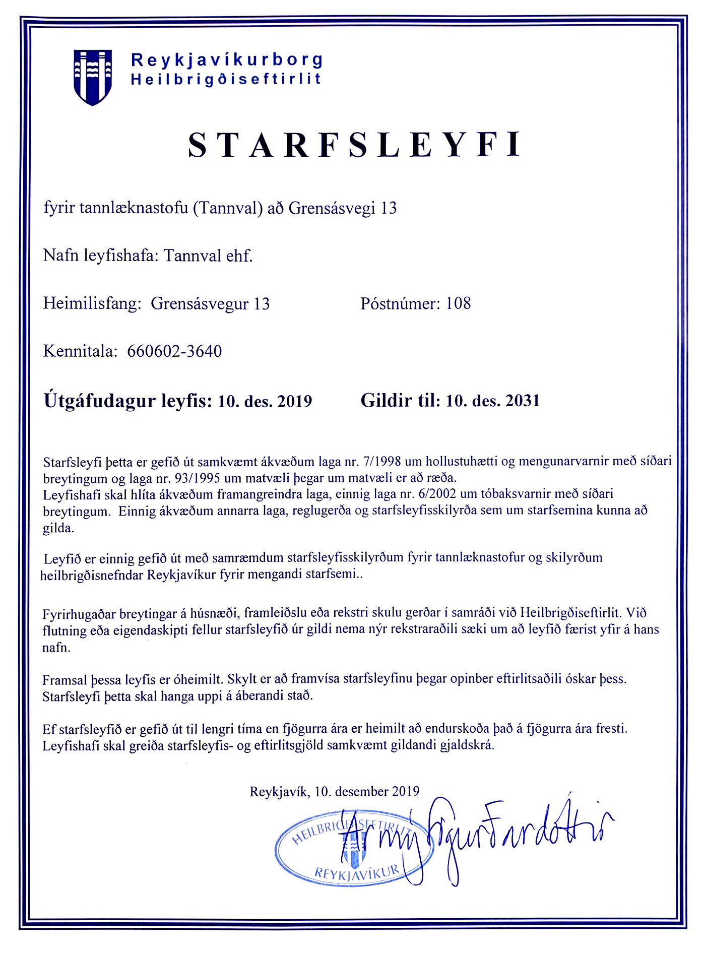 UM OKKUR Kristín Gígja Einarsdóttir Tannlæknir Gígja Tryggvadóttir Tannfræðingur Rakel Ósk Steindórsdóttir Tanntæknir Tannval tannlæknastofa Grensásvegur 13, 3.hæð 108 Reykjavík Sími: 568 5015 Smelltu til að skoða starfsleyfi frá Heilbrigðiseftirliti Reykjavíkur